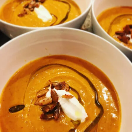 The first meal I created was for two beautiful friends who are moving to Chattanooga, TN in the next couple of weeks. I knew I wanted to share one last hurrah with them in the form of food, and the love and laughter we shared helped to set us all back onto a rhythm of eating with others and eating while fully present. We started with a Local Goat Cheese and Orange Cranberry Filo Tart with Thyme-Infused Honey – we had so much fun going to local cheese monger and trying so many cheeses, we weren’t sure if we would be hungry for the rest of the meal. Then we moved onto one of my childhood favorites, which I mistakenly called “Pukin Soup” at the age of five. I bolstered it up to create Pumpkin Bisque with Crispy Roasted Pepitas and Sage-Infused Olive Oil. Next we had Maple Baked Salmon with Sauteed Asparagus and a Miso Parsnip Puree – a wicked easy blend of roasted parsnips to bring out their sweetness, a tablespoon of white miso paste, and plenty of butter and cream to bring it all together. SO. GOOD. And for dessert, we finished with a Warm Vanilla Bourbon Blueberry Crumble with Fresh Whipped Cinnamon Cream.